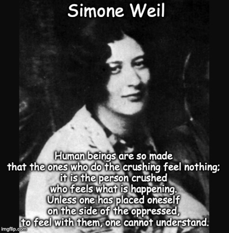 Human beings are so made that the ones who do the crushing feel nothing; it is the person crushed who feels what is happening. Unless one has placed oneself on the side of the oppressed, to feel with them, one cannot understand.