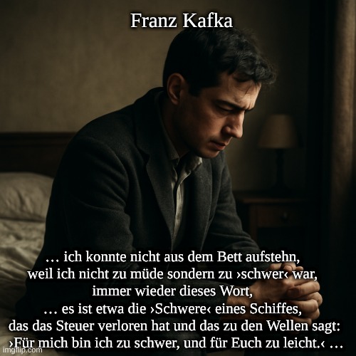 … ich konnte nicht aus dem Bett aufstehn, weil ich nicht zu müde sondern zu ›schwer‹ war, immer wieder dieses Wort, … es ist etwa die ›Schwere‹ eines Schiffes, das das Steuer verloren hat und das zu den Wellen sagt: ›Für mich bin ich zu schwer, und für Euch zu leicht.‹ …