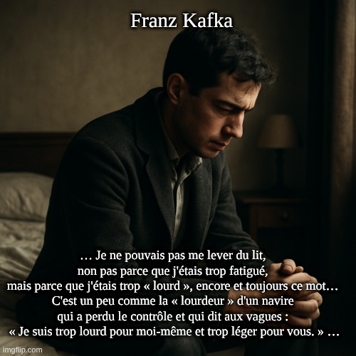 … Je ne pouvais pas me lever du lit, non pas parce que j’étais trop fatigué, mais parce que j’étais trop « lourd », encore et toujours ce mot… C’est un peu comme la « lourdeur » d’un navire qui a perdu le contrôle et qui dit aux vagues : « Je suis trop lourd pour moi-même et trop léger pour vous. » …