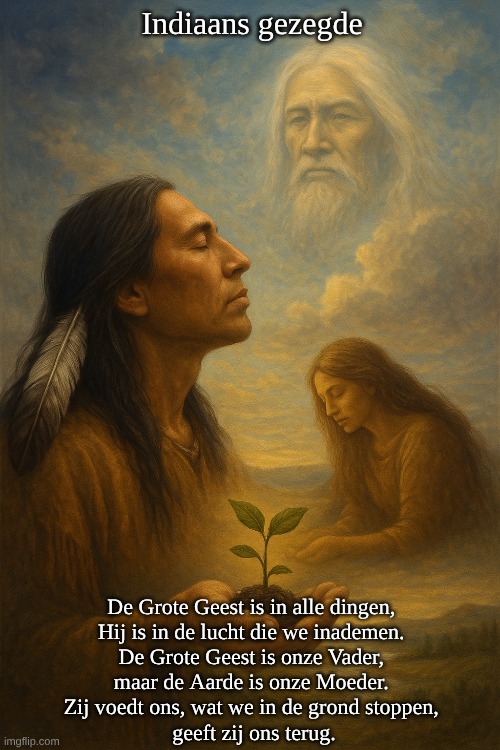 De Grote Geest is in alle dingen, Hij is in de lucht die we inademen. De Grote Geest is onze Vader, maar de Aarde is onze Moeder. Zij voedt ons, wat we in de grond stoppen, geeft zij ons terug.