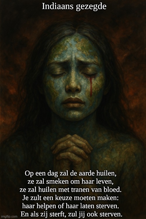 Op een dag zal de aarde huilen, ze zal smeken om haar leven, ze zal huilen met tranen van bloed. Je zult een keuze moeten maken: haar helpen of haar laten sterven. En als zij sterft, zul jij ook sterven.