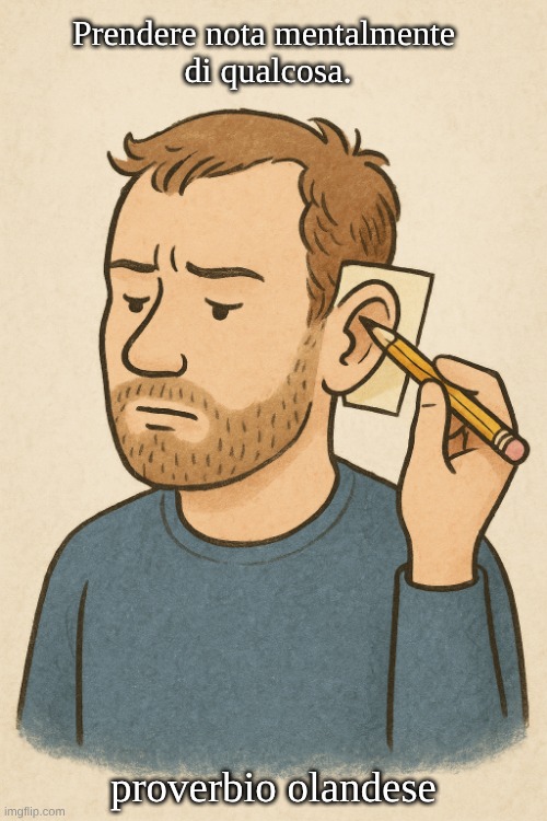 Immagine: Peter van Geest AI. Significato: “Imparare una lezione importante” o “ricordare bene qualcosa per la prossima volta”. Origine: Deriva dall’epoca in cui le persone scrivevano letteralmente le cose che non volevano dimenticare, o le segnavano simbolicamente sul corpo, come “dietro le orecchie”, una zona vicina alla testa (e quindi alla memoria). L’immagine è figurativa: qualcosa che si deve ricordare bene o prendere a cuore è, per così dire, “scritto” nella memoria, dietro le orecchie.