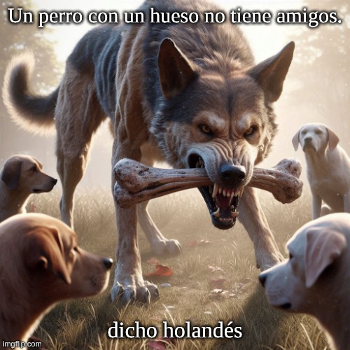 Imagen: Peter van Geest AI. Significado: El proverbio significa que quien posee algo valioso suele volverse egoísta y reacio a compartir, incluso con amigos. Así como un perro, al recibir un hueso, lo protege ferozmente e incluso ahuyenta a sus amigos, las posesiones también pueden cambiar a las personas. Señala el lado egoísta de la naturaleza humana cuando el interés propio está en juego. Origen: Se trata de un antiguo proverbio popular (siglos XVI y XVII) de autor desconocido. Estos proverbios se originaron en la sabiduría popular y se transmitieron oralmente antes de ser escritos. Forma parte del patrimonio cultural colectivo de la lengua neerlandesa.