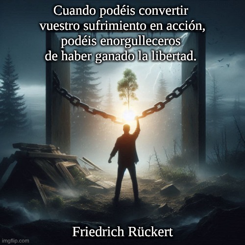Imagen: Peter van Geest AI. Significado: Rückert destaca aquí que la verdadera libertad surge cuando uno no solo experimenta el sufrimiento o los reveses como un mal pasivo, sino que hace algo activo con ellos: los convierte en acciones. Gracias a esa transformación, uno puede sentirse legítimamente «orgulloso» de la libertad adquirida, porque ha contribuido personalmente a superar el obstáculo en lugar de dejarse abrumar por él. En esencia, se trata de empoderamiento: actuar ante las dificultades conduce a la liberación interior. Fuente: Colección de poesía Gedichte (publicada entre 1840 y 1850), poema: «Die Freiheit»; en ediciones posteriores, el poema también se incluyó en la colección más amplia Gesammelte Werke (Obras completas) de Rückert.