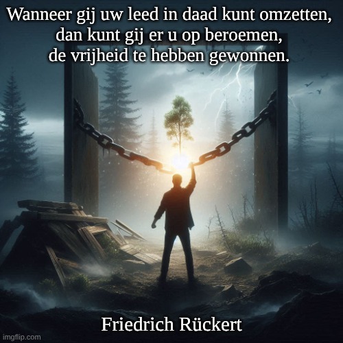 Afbeelding: Peter van Geest AI. Betekenis: Rückert benadrukt hier dat echte vrijheid ontstaat wanneer men lijden of tegenslagen niet alleen passief ondergaat, maar er actief iets mee doet – ze omzet in daden. Door deze transformatie kan men terecht “trots” zijn op de verworven vrijheid, omdat men zelf heeft bijgedragen aan het overwinnen van de hindernis, in plaats van zich er gewoon door te laten overweldigen. In wezen gaat het om empowerment: het nemen van maatregelen tegen moeilijkheden leidt tot innerlijke bevrijding. Bron: Gedichtenbundel Gedichte (gepubliceerd in de jaren 1840-1850), gedicht: “Die Freiheit” (De vrijheid), in latere uitgaven werd het gedicht ook opgenomen in de uitgebreidere verzameling Gesammelte Werke von Rückert (Verzamelde werken van Rückert).