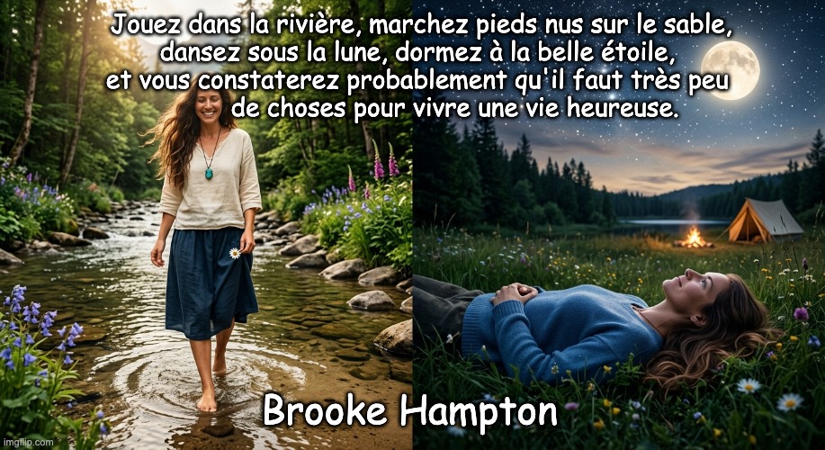 Image: Peter van Geest AI. Signification : Ce proverbe est un hymne à la simplicité et au lien avec la nature. Il nous rappelle que le bonheur ne se trouve pas toujours dans les possessions matérielles ou les réussites complexes, mais plutôt dans les aspects fondamentaux, souvent oubliés, de la vie. Analysons les différents éléments de ce proverbe :1.« Jouer dans la rivière » (Rivière 🌊). Cet élément évoque la spontanéité, la liberté et la joie pure. Il suggère de prendre le temps de jouer et de s’amuser, et de se laisser porter par le courant de la vie, comme on joue dans une rivière. Il peut aussi symboliser l’acceptation du changement et la joie trouvée dans le dynamisme de la vie. 2.« Marcher pieds nus sur le sable » (Sable 🏝️). Marcher pieds nus est un contact direct et tactile avec la terre. Cela symbolise l’ancrage, l’humilité et le lâcher-prise des barrières artificielles. Le sable, en particulier, évoque les plages et les déserts, lieux de repos et de contemplation. Il suggère de se reconnecter au monde naturel et d’apprécier la simplicité de l’existence. 3.« Danser sous la lune » (Lune 🌙). Cet élément ajoute une touche de magie, de romantisme et d’intuition. La lune est souvent associée aux émotions, à l’énergie féminine et au rythme de la nature. Danser sous la lune suggère de suivre ses élans intérieurs, de célébrer ses passions et d’apprécier la beauté et le mystère de l’univers. Cela peut aussi symboliser la joie que l’on trouve dans la nuit et l’acceptation de nos parts d’ombre et de lumière. 4.« Dormir à la belle étoile » (Étoiles ✨). C’est un puissant appel à se connecter au cosmos et à l’immensité de l’univers. Dormir à la belle étoile est un acte d’abandon et d’émerveillement. Cela nous rappelle notre insignifiance dans le grand ordre des choses et nous encourage à apprécier les merveilles du ciel nocturne. Cela peut aussi symboliser le repos, la paix et un sentiment de connexion avec quelque chose de plus grand que nous. 5.« Et vous découvrirez probablement qu’il faut très peu pour mener une vie heureuse. » C’est la conclusion et le message central de ce proverbe. Cela suggère qu’en nous concentrant sur ces expériences simples et naturelles, nous pouvons découvrir que le vrai bonheur ne provient pas de l’abondance matérielle, mais d’un sentiment de connexion, de présence et de joie dans les aspects fondamentaux de la vie. C’est un appel à un mode de vie minimaliste et à apprécier les petites choses. Origine et auteur : Cette citation est largement attribuée à Brooke Hampton. Penchons-nous sur son parcours et sur les raisons pour lesquelles ces mots lui correspondent si bien. Identité : Brooke Hampton est une écrivaine, entrepreneuse et mère américaine qui a bâti une importante communauté sur les réseaux sociaux grâce à ses prises de position en faveur d’une vie simple et authentique, au plus près de la nature. Livres : Elle est connue pour son livre « Enchanted Cedar : The Little Girl Who Believed in Magic », un ouvrage pour enfants qui explore les thèmes de la nature, de la magie et du pouvoir de l’imagination. « Barefoot Five » : Elle est également active sous le nom de « Barefoot Five », ce qui illustre parfaitement sa philosophie de vie. Ce nom évoque un désir d’ancrage, de simplicité et de connexion directe avec la nature, comparable à la sensation de marcher pieds nus sur le sable. Philosophie de vie : L’œuvre d’Hampton et sa présence en ligne témoignent d’une profonde appréciation du monde naturel, de la beauté du quotidien et du pouvoir de l’intention et de la présence. Ses propos trouvent souvent un écho auprès de ceux qui aspirent à une vie plus authentique et plus simple. Conclusion : La citation « Jouer dans la rivière, marcher pieds nus sur le sable, danser sous la lune, dormir sur… »« Parmi les étoiles, vous découvrirez sans doute qu’il suffit de peu pour mener une vie heureuse » est bien plus qu’une simple phrase. C’est un puissant rappel de l’essence de la vie, un appel à se reconnecter à la nature et une invitation à trouver le bonheur dans les choses simples. Attribuée à Brooke Hampton, une écrivaine dont la vie et l’œuvre incarnent ces valeurs, cette citation continue de résonner et d’inspirer. Elle nous rappelle que ce ne sont souvent ni les grandes réussites ni les possessions matérielles qui nous comblent le plus, mais les moments de pure présence, de joie et de connexion avec le monde naturel.