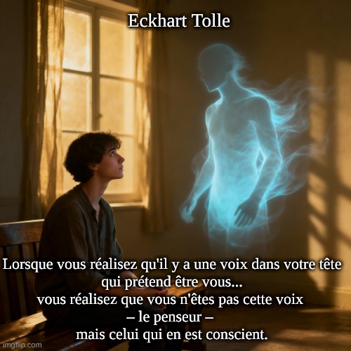 Lorsque vous réalisez qu’il y a une voix dans votre tête qui prétend être vous… vous réalisez que vous n’êtes pas cette voix – le penseur – mais celui qui en est conscient.