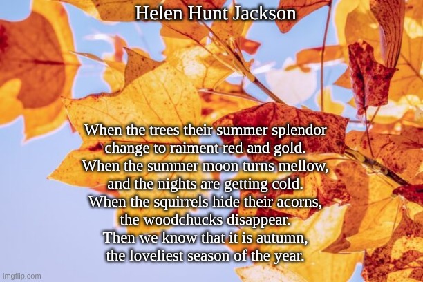 When the trees their summer splendor change to raiment red and gold. When the summer moon turns mellow, and the nights are getting cold. When the squirrels hide their acorns, the woodchucks disappear. Then we know that it is autumn, the loveliest season of the year.