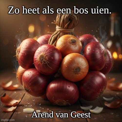 Afbeelding: Peter van Geest AI. 🧐 Betekenis:  Als we de uitdrukking letterlijk nemen en proberen te interpreteren, kunnen we het volgende bedenken: “Heet” kan verwijzen naar: Temperatuur: Erg warm 🔥. Pittigheid/Scherpte: Net zoals uien scherp van smaak kunnen zijn 🧅. Intensiteit / Gepassioneerdheid: Iets dat met veel vuur of emotie gebeurt. “Bos uien”: Een verzameling uien. Uien staan bekend om hun vermogen om de ogen te irriteren en te laten tranen wanneer ze gesneden worden, wat een “heet” of branderig gevoel kan geven. Op basis hiervan zou “zo heet als een bos uien” letterlijk kunnen betekenen: Erg heet van temperatuur: Bijvoorbeeld, een gerecht dat gloeiend heet is. Extreem pittig of scherp: Iets dat zo krachtig is dat het bijna pijn doet, vergelijkbaar met de scherpte van rauwe ui. Zeer intens of fel: Een situatie of emotie die overweldigend is. De auteur gebruikte het figuurlijk om iemand te benoemen die “hitsig”, “wellustig”, “vurig”, “heet” is📜 Oorsprong: Bedacht als een humoristische of absurde vergelijking. Regionaal of familiejargon: Het kan een uitdrukking zijn die binnen een zeer lokale gemeenschap beperkt wordt gebruikt. ✍️ Auteur: Arend van Geest ( 1930 – 2000) , ontleend aan de agrarische sektor, in de omgeving van het Westland, “de glazen kas” in Zuid-Holland. Conclusie: Het is een leuke, beeldende uitdrukking die zeker de aandacht trekt!