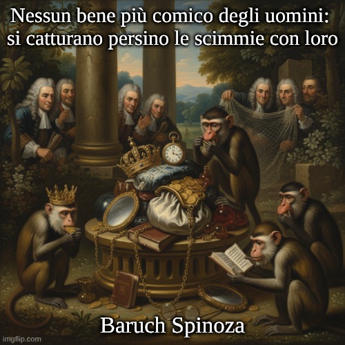 Immagine: Peter van Geest AI. Significato 🧐: Il detto esprime un punto di vista filosofico e in qualche modo satirico sulla natura del bene e del male e sui desideri umani. “Non c’è bene più allegro delle persone”: questo significa qualcosa come “non c’è ‘bene’ più divertente, più assurdo o più banale delle persone”. Suggerisce che ciò che le persone considerano “bene” può, da una prospettiva più ampia, essere ridicolo o di scarso valore. È una relativizzazione dei valori umani. “Con loro puoi persino catturare le scimmie”: questa parte sottolinea la banalità dei “beni” umani. Le cose a cui le persone danno valore (piacere, status, beni materiali) sono così basilari e semplici da essere paragonabili all’esca usata per catturare le scimmie. Implica che i desideri umani non siano molto diversi da quelli degli animali e che le persone, nonostante la loro percepita superiorità, siano facilmente manipolabili da questi “beni” basilari. In sostanza, si tratta di un’osservazione critica sulla natura umana, che sostiene che le nostre idee di “bene” sono spesso banali e non così elevate come pensiamo, e che quindi siamo facilmente “intrappolati”. Origine e autore 📜: Questa frase profonda e in un certo senso cinica proviene dal famoso filosofo olandese Baruch Spinoza. Autore: Baruch Spinoza (1632-1677) Opera: L’affermazione si trova nella sua opera principale, l’Etica, dimostrata secondo un metodo geometrico (completata nel 1675, pubblicata postuma nel 1677). Nello specifico, appare nel Libro III, dove Spinoza discute delle emozioni e dei desideri umani. Spinoza usa questa osservazione per sostenere la sua tesi più ampia secondo cui “bene” e “male” non sono proprietà intrinseche delle cose, ma piuttosto riflessi dei nostri desideri, emozioni e giudizi. È una parte fondamentale della sua filosofia sulla condizione umana e sulla soggettività dei valori.