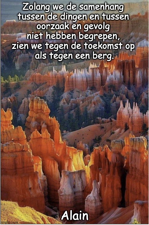 Zolang we de samenhang tussen de dingen en tussen oorzaak en gevolg niet hebben begrepen, zien we tegen de toekomst op als tegen een berg.