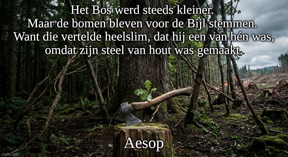 Afbeelding: Peter van Geest AI. Betekenis 📖 💡: Dit gezegde is een krachtige en veelgebruikte politieke allegorie. Het waarschuwt voor manipulatie en de gevolgen van het stemmen tegen je eigen belangen in. De allegorie werkt op verschillende niveaus: De Metafoor: Het Bos 🌳: Vertegenwoordigt een groep mensen of een samenleving. De Bomen 🌲: Zijn de individuele burgers, vaak degenen die kwetsbaar of gewone werkende mensen zijn. De Bijl 🪓: Staat symbool voor een externe kracht, een dictator, een onderdrukkende regering of een politiek systeem dat de groep uiteindelijk zal schaden. De Houten Steel 🪵: Dit is het cruciale element. Het is de bedrieglijke connectie die de Bijl gebruikt om het vertrouwen van de Bomen te winnen. Het is een oppervlakkige gelijkenis die misleidend is. Het Centrale Thema: Het gezegde illustreert hoe mensen overtuigd kunnen worden om een leider of beleid te steunen dat hen uiteindelijk zal schaden. De Bijl overtuigt de Bomen dat hij “een van hen” is, ondanks het feit dat zijn ware aard en functie (een moordwapen) destructief voor hen zijn. 🏺 Oorsprong en Variaties: De oorsprong van deze fabel is oud en heeft diepe wortels in de westerse literatuur. Aesop’s Fabels: De basisgedachte komt van de Griekse fabelschrijver Aesop (ongeveer 600 v.Chr.). In zijn fabel “De Houthakker en het Bos”, vraagt een houthakker de bomen om een stuk hout voor een handvat voor zijn bijl. De bomen, dom genoeg, willigen zijn verzoek in. Zodra de bijl een steel heeft, begint de houthakker het bos om te hakken. Het moraliserende einde waarschuwt tegen het geven van de middelen van vernietiging aan je vijand. Verschillende Versies: Het concept is door de eeuwen heen aangepast en geherinterpreteerd. Er zijn versies waarin de bomen ruzie maken en een ‘koning’ kiezen (de bijl), die hen vervolgens vernietigt. Een bekende Engelse versie,“The Woodman and the Trees”, volgt een soortgelijk verhaal. 🖋️ Auteur van deze Specifieke Versie: De specifieke verwoording in uw afbeelding: “Het Bos werd steeds kleiner. Maar de bomen bleven voor de Bijl stemmen. Want die vertelde heel slim, dat hij een van hén was, omdat zijn steel van hout was gemaakt.” is een moderne, zeer geconcentreerde parafrase. Het is niet toe te schrijven aan één specifieke moderne auteur. In plaats daarvan is het een geëvolueerde, meer cynische en direct politieke versie die populair is geworden in het publieke debat en op sociale media. Het wordt vaak gebruikt als een kritiek op populisme of politieke onnozelheid. Conclusie: Hoewel de kerngedachte teruggaat op Aesop, is de moderne “stemmen voor de bijl” versie een krachtig, anoniem stukje politieke folklore geworden. 🌳🪓