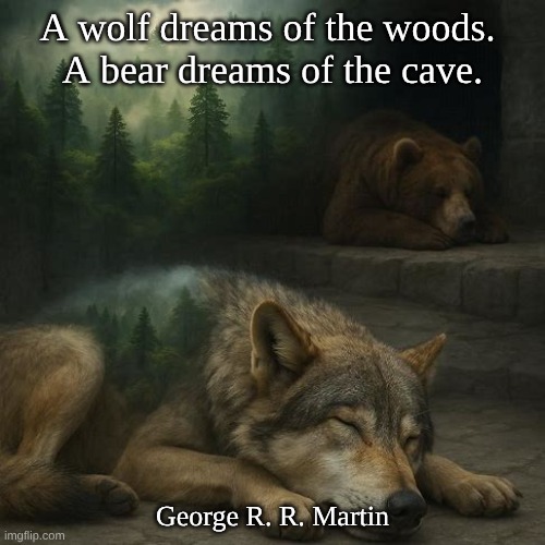 Een wolf droomt van het woud. Een beer droomt van de grot.