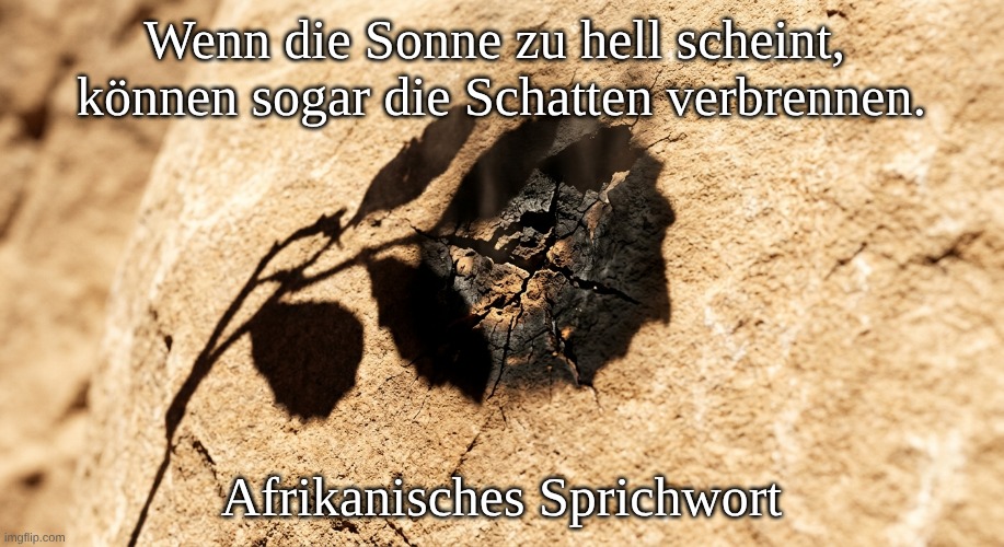 Die wichtigsten Interpretationen sind: Kein sicherer Hafen: Schatten steht normalerweise für Schutz, Kühle und Sicherheit vor der Hitze der Sonne. Wenn es „so heiß“ wird, dass sogar der Schirm „brennt“, bedeutet das, dass es „überhaupt keinen Schutz mehr“ gibt. Die Situation ist überwältigend und destruktiv. Totale Zerstörung: Es deutet auf eine Situation hin, in der sogar die Dinge betroffen sind, die von Natur aus schützend oder zweitrangig sind (der Schatten existiert nur „dank“ des Objekts und der Sonne). Es weist auf eine zerstörerische Kraft hin, sei es im wahrsten Sinne des Wortes Hitze oder bildliche Leidenschaft, Wut oder Macht. Die Kehrseite der Extreme: Sie erinnern uns daran, dass zu viel des Guten (die Sonne, die oft mit Leben und Wachstum in Verbindung gebracht wird) zu etwas Zerstörerischem werden kann. In einem Satz: Es beschreibt eine Situation, die so extrem oder intensiv ist, dass selbst normale Zufluchtsorte oder Schutzmechanismen nicht mehr funktionieren. 🌍 Autor: Kein bestimmter Autor, wie die meisten Sprichwörter und Volksweisheiten, dieses Sprichwort „Kein bekannter einzelner Autor“. Es entstand organisch innerhalb einer Kultur und wurde mündlich weitergegeben. 🌍 Afrikanischer Ursprung (sehr wahrscheinlich): Viele Quellen und Sammlungen globaler Sprichwörter führen dieses Sprichwort auf einen afrikanischen Ursprung zurück. Das Bild einer Sonne, die so intensiv ist, dass sie alles, einschließlich der Schatten, bedroht, passt perfekt zur geografischen und klimatischen Realität vieler Teile des afrikanischen Kontinents. Die Sonne ist dort eine dominierende, lebensspendende, aber manchmal rücksichtslose Kraft. Afrikanische Sprichwörter sind bekannt für ihre lebendigen, naturbezogenen Metaphern, mit denen sie tiefe menschliche Wahrheiten zum Ausdruck bringen. Dieses Sprichwort fügt sich nahtlos in diese Tradition ein. Fazit zur Herkunft: Obwohl das genaue Volk oder die Region oft nicht genannt wird, herrscht weitgehend Einigkeit darüber, dass es sich um ein „traditionelles afrikanisches Sprichwort“ handelt.