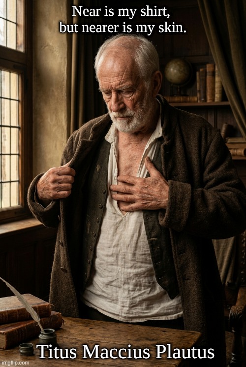 – Italian 🇮🇹: ‘La camicia è più vicina alla pelle che la giubba.’ (The shirt is closer to the skin than the jacket.) 📜 Historical Context: While Plautus is credited with the written record, the proverb reflects a common human truth that predates him. By the 16th and 17th centuries, the English version became a staple in collections of proverbs, such as those by ‘John Heywood’ (1546), who helped solidify its place in the English language. 📖🛡️ Usage Today: In modern conversation, the phrase is often used to: