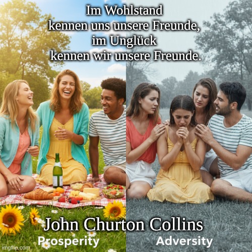 Bild: Peter van Geest AI.  Bedeutung: Wahre Freundschaft zeigt sich am besten in schwierigen Zeiten. Wenn alles gut läuft, geben viele vor, Freunde zu sein, doch erst in Krisenzeiten offenbaren sich die wahren Freunde. Ursprung: Dieses Sprichwort wird verschiedenen Autoren zugeschrieben und ist in vielen Kulturen bekannt. Die Vorstellung, dass sich wahre Freundschaft in Krisenzeiten zeigt, ist ein zeitloses und universelles Thema in Literatur und Volksweisheit. Autor: Obwohl das Zitat oft mit John Churton Collins in Verbindung gebracht wird, lässt sich der genaue Ursprung des Sprichworts weder ihm noch einem anderen Autor eindeutig zuordnen. Es ist möglich, dass die Idee im Laufe der Jahre von verschiedenen Schriftstellern und Denkern in unterschiedlichen Formen aufgegriffen und abgewandelt wurde. Fazit: Dieses Zitat unterstreicht den Wert wahrer Freundschaft und die Bedeutung von Unterstützung in schwierigen Zeiten. Es bleibt eine relevante Botschaft sowohl in persönlichen Beziehungen als auch im gesellschaftlichen Kontext.