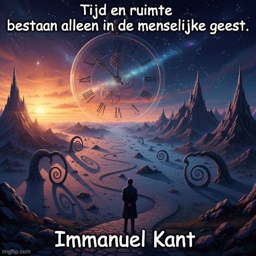 Afbeelding: Peter van Geest AI. Betekenis:Tijd en ruimte: Deze concepten worden vaak gezien als fundamentele dimensies van de werkelijkheid. Menselijke geest: De uitspraak suggereert dat onze perceptie van tijd en ruimte niet absoluut is, maar eerder een constructie van onze geest. Interpretatie: Het idee is dat tijd en ruimte in wezen subjectief zijn en afhankelijk van hoe mensen ze ervaren en begrijpen. Oorsprong: De uitspraak wordt vaak toegeschreven aan de Duitse filosoof Immanuel Kant, die in zijn werk “Kritik der reinen Vernunft” (1781) stelt dat tijd en ruimte vormen zijn van onze waarneming. Het idee dat tijd en ruimte niet onafhankelijk van ons bestaan, maar als concepten in onze geest bestaan, is een centraal thema in de moderne filosofie. Auteur: Hans Peter Roel wordt soms ook genoemd, maar is niet de auteur van deze specifieke uitspraak. Het lijkt erop dat er een verwarring is. Immanuel Kant is de juiste auteur die soortgelijke ideeën heeft gepresenteerd in zijn filosofische werken. Conclusie: Deze uitspraak moedigt ons aan om na te denken over de aard van onze realiteit en hoe onze geest de wereld om ons heen interpreteert. Het is een uitnodiging tot reflectie over de subjectieve ervaring van tijd en ruimte.