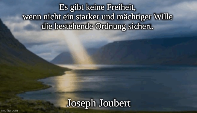 Foto: Davide Cantelli. Bedeutung: Die zugrunde liegende Idee ist, dass Freiheit nicht einfach losgelöst von Regeln und Autorität existiert; sie erfordert eine stabile Basis, innerhalb derer sich Menschen frei bewegen können, ohne Angst vor Chaos oder unkontrollierbaren Situationen haben zu müssen. Wenn es keine starke Hand gibt, die die bestehende Ordnung schützt, droht Unordnung, wodurch gerade die Freiheit des Einzelnen gefährdet wird. Herkunft: Aus den hinterlassenen Aufzeichnungen von Joseph Joubert. Diese wurden nach seinem Tod veröffentlicht, zunächst 1838 unter dem Titel Recueil des Pensées de M. Joubert (eine von Chateaubriand zusammengestellte Anthologie) und später ausführlicher als Pensées, Essais, Maximes et Correspondance de J. Joubert im Jahr 1842 von Paul de Raynal, einem Neffen des Autors.