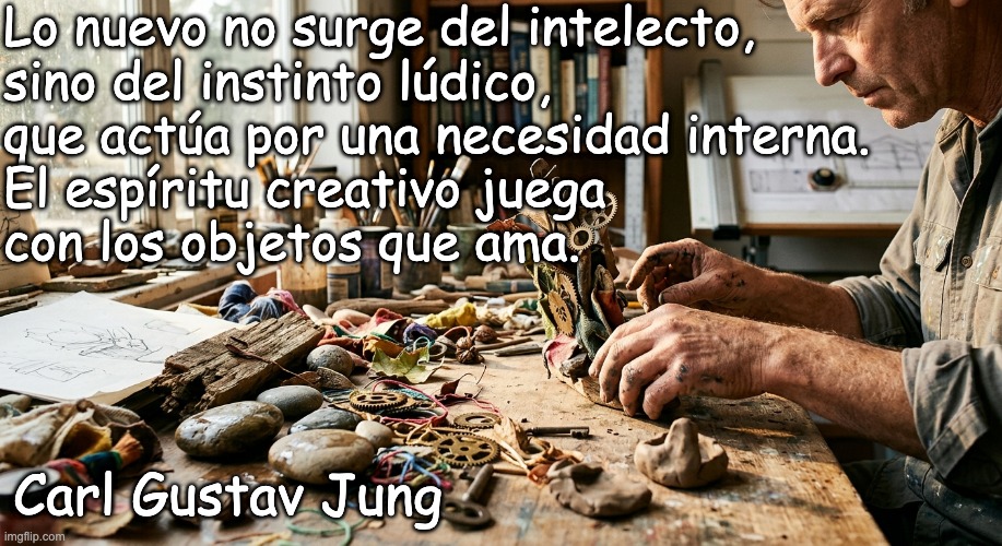 Imagen: Peter van Geest AI. Significado 💡: Esta es una de las afirmaciones más influyentes y citadas del psiquiatra suizo Carl Gustav Jung sobre el proceso creativo. Esta cita contiene la esencia de la visión de Jung sobre la creatividad. Desafía la idea tradicional de que la creatividad es simplemente producto del pensamiento lógico y el esfuerzo intelectual. Estos son los elementos clave del significado: 1.La limitación del intelecto: El intelecto es analítico, lógico y estructurador. Es esencial para «refinar» ideas, pero, según Jung, no para la «creación» de cosas verdaderamente «nuevas». El intelecto a menudo reproduce o reestructura lo que ya se conoce. 2.El «instinto lúdico» (Impulso de juego): 🎨 La creatividad surge de un estado de libertad, experimentación y apertura. Jung lo denomina el «instinto lúdico» (por analogía con el concepto de «Spieltrieb» de Friedrich Schiller). Cuando «jugamos», no estamos sujetos a reglas rígidas ni a objetivos prácticos directos. Esto permite a la mente establecer nuevas asociaciones y pensar de forma innovadora. 3.Actuar por «Necesidad Interior»: Esta es una distinción crucial. Este «juego» no es una actividad aleatoria ni superficial. Está impulsado por un impulso o necesidad profunda e inconsciente. El impulso creativo surge del inconsciente y ‘debe’ expresarse. El artista o explorador «debe» crear, no porque sea lógico, sino porque una fuerza interior lo obliga. 4.Los «Objetos que ama»: 🎨 La creatividad también es un proceso emocional. La mente «juega» con sujetos, ideas, materiales o conceptos con los que existe un profundo vínculo emocional o psicológico. El amor por el sujeto es el combustible del juego creativo. 🔍 Origen y contexto: Autor:Carl Gustav Jung (C.G. Jung).Fuente: La obra «Psychologische Typen» (título original en alemán: «Psychologische Typen»). Año de publicación: 1921. Ubicación en la obra: Esta cita se encuentra en el párrafo 197. En la edición estándar en inglés de sus obras completas, se puede encontrar en: «Obras completas de C.G. Jung, vol. 6: Tipos psicológicos», párr. 197. 🌱 En resumen: Para Jung, la verdadera creatividad es una síntesis de una necesidad profunda e interna (a menudo inconsciente) y una actitud lúdica y abierta hacia el mundo, en la que el intelecto solo interviene posteriormente para dar forma a lo que ha producido el «impulso lúdico».