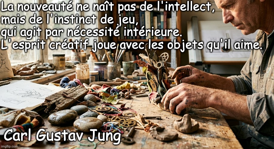 Image: Peter van Geest AI. Signification 💡 : Il s’agit de l’une des citations les plus influentes et les plus célèbres du psychiatre suisse Carl Gustav Jung concernant le processus créatif. Cette citation renferme l’essence même de la conception jungienne de la créativité. Elle remet en question l’idée traditionnelle selon laquelle la créativité serait simplement le fruit de la pensée logique et de l’effort intellectuel. Voici les éléments clés de cette signification : 1.Les limites de l’intellect : L’intellect est analytique, logique et structurant. Il est essentiel pour « affiner » les idées, mais, selon Jung, non pour « créer » des choses véritablement « nouvelles ». L’intellect reproduit ou restructure souvent ce qui est déjà connu. 2.L’« instinct de jeu » (pulsion ludique) : 🎨 La créativité naît d’un état de liberté, d’expérimentation et d’ouverture. Jung appelle cela l’« instinct de jeu » (par analogie avec le concept de « Spieltrieb » de Friedrich Schiller). Lorsque nous « jouons », nous ne sommes pas contraints par des règles rigides ni par des objectifs pratiques directs. Cela permet à l’esprit d’établir de nouvelles associations et de sortir des sentiers battus. 3.Agir par « nécessité intérieure » : Il s’agit d’une distinction cruciale. Ce « jeu » n’est pas une activité aléatoire ou superficielle. Il est mû par un besoin ou une pulsion profonde et inconsciente. L’impulsion créatrice provient de l’inconscient et *doit* s’exprimer. L’artiste ou l’explorateur « doit » créer, non par logique, mais parce qu’une force intérieure l’y contraint. 4.Les « objets qu’il aime » : 🎨 La créativité est aussi un processus émotionnel. L’esprit « joue » avec des sujets, des idées, des matériaux ou des concepts avec lesquels il existe un lien émotionnel ou psychologique profond. L’amour pour le sujet alimente ce jeu créatif. 🔍 Origine et contexte : Auteur :Carl Gustav Jung (C.G. Jung).Source : L’ouvrage « Psychologische Typen » (titre original allemand : « Psychologische Typen »). Année de publication : 1921. Emplacement dans l’ouvrage : Cette citation se trouve au paragraphe 197. Dans l’édition anglaise standard de ses œuvres complètes, elle figure dans : « Œuvres complètes de C.G. Jung, vol. 6 : Types psychologiques », paragraphe 197. 🌱 En bref : Pour Jung, la véritable créativité est une synthèse entre un besoin profond et intérieur (souvent inconscient) et une attitude ludique et ouverte envers le monde, l’intellect n’intervenant que plus tard pour façonner le fruit de cette pulsion ludique.