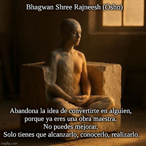 Imagen: Peter van Geest AI. Significado: En lugar de esforzarte por alcanzar una versión ideal de ti mismo en el futuro, reconoces que ya estás completo ahora. Según Osho, la idea de que “tienes que convertirte en algo” es una ilusión que genera inquietud e insatisfacción. La verdadera libertad y paz surgen cuando comprendes que no necesitas transformación, sino solo consciencia de lo que ya existe. Fuente: Este mensaje resuena profundamente con tradiciones no dualistas como el Vedanta Advaita y el Zen, en las que el yo se considera indivisible y completo: la liberación no es un proceso de transformación, sino una revelación.