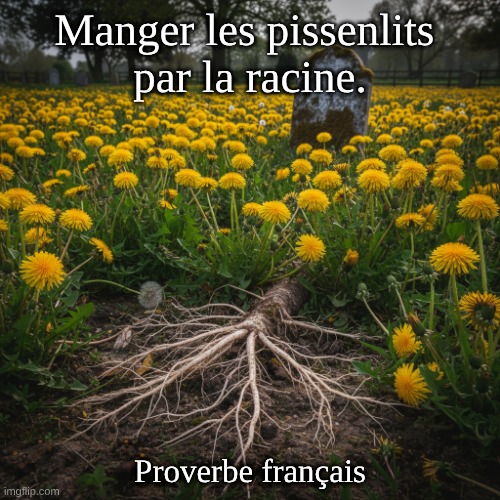 Image: Peter van Geest AI. Sens (signification) 🧠: Expression familière qui signifie “être mort et enterré”. Image: Une personne enterrée sous terre “mangerait” les racines des pissenlits, puisqu’elle se trouve en dessous d’elles. Origine 📜:Métaphore funèbre liée à l’enterrement en terre: on se retrouve “sous” les racines. Attestée dans l’argot et la langue familière française au moins depuis le milieu du XIXe siècle. Diffusée par l’usage populaire; le cinéma et la chanson l’ont renforcée par la suite (par ex. le film “Les pissenlits par la racine”, 1964). Auteur ✍️: Pas d’auteur unique: c’est une locution idiomatique populaire, née de l’argot. Ce n’est pas une “citation” attribuable à une personne en particulier.