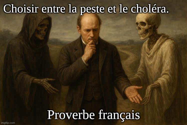 Image: Peter van Geest AI. Signification : il faut choisir entre deux options tout aussi peu attrayantes ou catastrophiques : quel que soit son choix, il sera mauvais. Cela fait référence à un dilemme sans issue favorable. Origine : cette expression apparaît dans les journaux et la littérature vers 1850-1900. Elle était principalement utilisée dans un contexte politique et social : proposer deux mauvaises solutions.