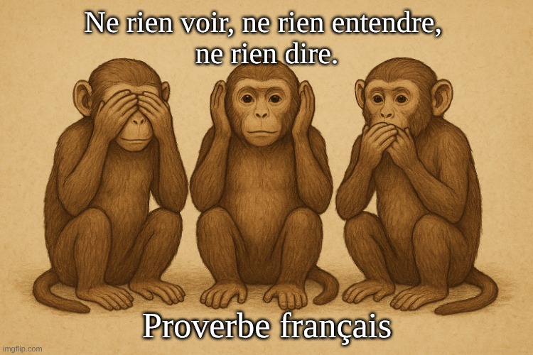 Image: Peter van Geest AI. Signification : 1. Morale/éthique : il ne faut ni voir, ni entendre, ni dire de mal, c’est-à-dire ne pas se livrer à de mauvaises actions ou à la négativité. 2. Pragmatique/ironique : faire semblant de ne rien voir, entendre ou dire pour éviter les problèmes, c’est-à-dire ignorer délibérément le mal ou rester à l’écart. Origine : cette expression vient du Japon, où elle était déjà associée au XVIIe siècle à une sculpture du sanctuaire Tōshō-gū à Nikkō. On y trouve trois sculptures sur bois représentant des singes qui illustrent cette règle.