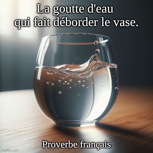 Image: Peter van Geest AI. Signification : Le dernier d’une série d’irritations, de problèmes ou d’événements qui fait perdre patience à quelqu’un ou rend une situation intenable. L’image est celle d’un seau qui se remplit lentement de gouttes – chaque goutte en soi est insignifiante, mais finalement, une dernière goutte fait déborder le seau. Ainsi, un petit événement peut sembler anodin en soi, mais s’il fait suite à une longue série de problèmes, il peut rendre la situation intenable. Cette expression est utilisée pour indiquer que la patience, la tolérance ou la capacité d’une personne à supporter quelque chose est complètement épuisée. Origine : Une très vieille expression dont l’origine exacte et l’auteur ne peuvent être déterminés avec certitude. L’expression vient probablement du latin « gutta cavat lapidem » (une goutte creuse la pierre), mais la forme spécifique avec le seau semble être d’origine néerlandaise ou germanique.