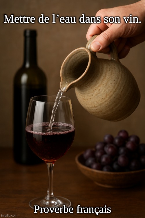 Image: Peter van Geest AI. Signification : faire un compromis, céder ou modérer ses exigences afin de parvenir à un accord. On « dilue » en quelque sorte ses propres désirs afin de permettre la coopération ou la paix. Origine : dicton populaire traditionnel. L’expression provient de l’ancienne culture européenne de la boisson. Dans l’Antiquité classique (notamment chez les Grecs, puis chez les Romains), le vin était presque toujours dilué avec de l’eau. Boire du vin pur était considéré comme incivilisé ou malsain. Une personne qui était prête à ajouter de l’eau à son vin montrait ainsi qu’elle était disposée à rester calme, à éviter les conflits ou à adopter une attitude plus modérée. Au Moyen Âge et au début de l’époque moderne, cette image a été conservée : ajouter de l’eau au vin affaiblit le goût → au sens figuré : affaiblir son point de vue pour le rendre acceptable aux yeux des autres.