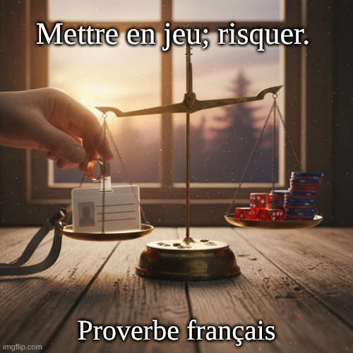 Image: Peter van Geest AI. Signification : Prendre consciemment un risque ou mettre quelque chose en jeu, souvent avec un enjeu important. Auteur : Aucun auteur spécifique. Il s’agit d’une expression traditionnelle/proverbe issu naturellement de l’usage linguistique et consigné historiquement dans des dictionnaires et des textes.