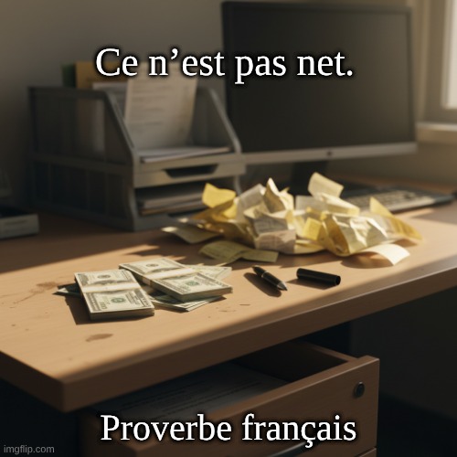 Image: Peter van Geest AI. Signification 🔍 : Sens général: “Ce n’est pas clair”, “quelque chose cloche”, “il y a anguille sous roche” Connotation: Soupçon de doute, d’irrégularité ou de malhonnêteté (sans preuve formelle). Pour une personne: “Il/elle n’est pas net(te)” peut signifier “bizarre”, “instable” ou “pas très honnête”, selon le contexte. Origine et histoire:Mot “net”: vient de l’ancien français net (du latin nitidus “brillant, propre”), d’abord “propre, sans tache”, puis par extension “clair, distinct”. Construction négative “pas net”: Attestée dans la langue populaire au moins depuis le XIXe siècle, pour marquer le doute ou le caractère louche d’une situation. À noter: Ce n’est pas un “dicton” au sens proverbial; c’est une locution idiomatique courante. Auteur: Aucun auteur identifié. Expression issue de l’usage populaire et de l’évolution naturelle du mot “net”.