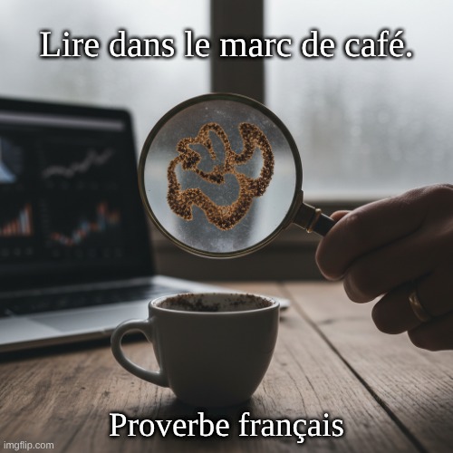 Image: Peter van Geest AI. Signification ☕🔮 : Faire des prédictions ou tirer des conclusions sans données suffisantes ; pure conjecture/spéculation. Souvent utilisé dans la formule : « C’est encore de la conjecture » = c’est incertain et difficile à estimer. Origine 📜 : Littéralement, cela fait référence à la divination par la lecture des motifs dans le marc de café (tasséographie), une pratique originaire du Moyen-Orient/Empire ottoman qui s’est répandue en Europe par le biais des cafés. L’expression néerlandaise est utilisée depuis longtemps (documentée depuis le XIXe siècle) comme métaphore des prédictions incertaines. Auteur ✍️ : Pas d’auteur spécifique. C’est une expression/un idiome figé du langage courant. Exemples 🗣️ : « Sans données récentes, il est encore impossible de prédire si le marché va se redresser.» « Ce que le temps fera dans deux semaines est une pure conjecture.» Équivalents dans d’autres langues 🌍 : Anglais : Crystal-ball gazing ; To read tea leaves ; It’s any’s guess ; Pure guesswork. Allemand : À lire au café. Conseil d’utilisation ✅ : Souvent empreint de relativisme ou de prudence ; utile pour modérer les attentes en l’absence de preuves concrètes.