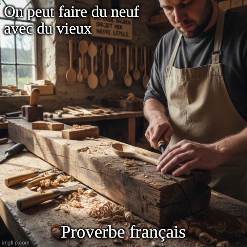 Image: Peter van Geest AI. Signification :Message clé : Cette expression signifie qu’il est possible de créer des objets nouveaux et utiles à partir de matériaux anciens ou usagés. Elle souligne l’importance du réemploi, de la créativité et de l’ingéniosité. Origine : Ce proverbe français trouve son origine dans les pratiques artisanales traditionnelles, où le bois et d’autres matériaux étaient souvent réutilisés pour créer de nouveaux produits. Il reflète une valeur culturelle plus large, présente dans de nombreuses sociétés : l’idée de durabilité et d’appréciation des ressources disponibles. Auteur : L’origine exacte ou l’auteur de cette expression est difficile à retracer, car il s’agit d’un savoir populaire transmis de génération en génération. Souvent, ces proverbes ne sont pas attribués à un seul auteur, mais émergent de l’expérience et de la sagesse collectives d’une communauté. Conclusion : Ce proverbe est un bel exemple de la façon dont la sagesse traditionnelle peut nous inspirer à être créatifs et durables dans l’utilisation des ressources dont nous disposons. 🌳✨
