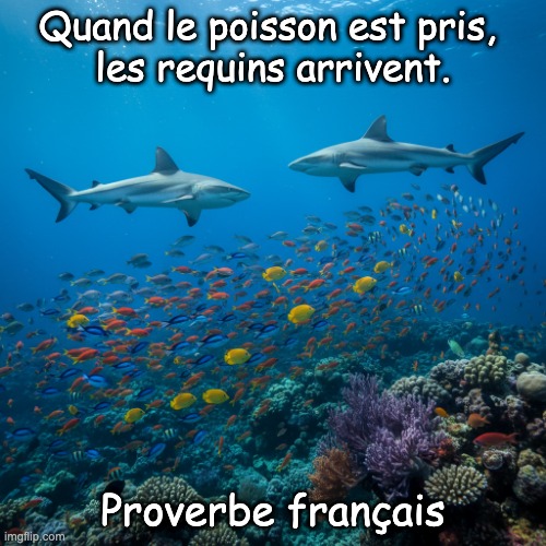 Image- Peter van Geest AI. Signification : Cette expression signifie que lorsqu’une personne réussit ou accomplit quelque chose de remarquable, des opportunistes (les « requins ») cherchent toujours à tirer profit de la situation. Elle souligne l’idée que le succès attire souvent ceux qui veulent profiter des efforts d’autrui. Origine : L’origine de cette expression est incertaine, mais l’utilisation des métaphores du poisson et du requin est fréquente dans la langue et la littérature françaises. L’opportunisme est un thème récurrent dans les contes et les proverbes, ce qui confère à cette expression une pertinence intemporelle. Auteur : Ce proverbe n’a pas d’auteur précis, car il s’agit d’une expression populaire utilisée familièrement. C’est un exemple de concept universel qui se retrouve à travers les cultures et les langues, comparable à des dictons similaires dans d’autres langues.