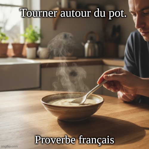 Image: Peter van Geest AI. Signification 🧭: Parler de manière indirecte, éviter d’aborder franchement le sujet. Différer l’aveu ou la demande, tergiverser, éluder la question. Équivalent en anglais: “to beat around the bush”.Origine (hypothèses principales) 🏺: Image culinaire: on « tourne » autour du pot de cuisine sans oser y plonger la louche — métaphore d’une hésitation à « aller au cœur » de la chose. Pot de chambre: Selon une explication populaire, on n’osait pas demander l’objet et l’on « tournait autour » du sujet par pudeur. Attestation: l’expression est ancienne et est relevée dans la langue française depuis l’époque moderne (XVIe siècle). L’étymologie exacte n’est pas unanimement fixée, mais l’idée de « contourner au lieu d’aller droit » est au cœur de toutes les explications. Auteur ✍️:Aucune attribution: ce n’est pas une « citation » d’auteur, mais une locution idiomatique de la langue française, passée dans l’usage courant. Synonymes proches 🔁: Éviter le sujet, éluder, biaiser, tergiverser. Antonyme: Aller droit au but; ne pas y aller par quatre chemins. Exemples d’usage 💬: « Arrête de tourner autour du pot et dis-moi ce que tu penses. » « Il a tourné autour du pot pendant dix minutes avant d’annoncer la décision. »