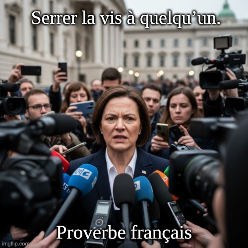 Image: Peter van Geest AI. 🧠 Signification (sens): Expression idiomatique française qui signifie:Exercer une pression plus forte sur quelqu’un. Devenir plus strict, renforcer la discipline ou le contrôle. Limiter les libertés, les moyens ou la marge de manœuvre de quelqu’un. Registre: Courant, parfois familier selon le contexte. Connotation: Souvent un peu négative (rigueur accrue, sévérité). 🔧 🪛 Origine: Métaphore mécanique: en serrant une vis, on augmente la pression/contrainte. L’image renvoie aux dispositifs à vis (presse à vis, serre-joints) utilisés depuis longtemps pour comprimer/maintenir; resserrer → plus de pression.L’usage figuré est bien installé dans le français moderne (XXe siècle), dans la même famille d’images que “tourner la vis” ou “resserrer l’étau”. 🔩 ✍️ Auteur: Il ne s’agit pas d’une “citation” attribuable à un auteur précis, mais d’une expression idiomatique de la langue française. Aucun auteur unique: c’est un usage collectif et traditionnel. 🗣️ Exemples d’emploi: “Le manager a serré la vis après les retards répétés.” “Le gouvernement serre la vis sur les dépenses publiques.” “Si les résultats ne s’améliorent pas, on va vous serrer la vis.” 🔁 Synonymes proches: Durcir le ton; mettre la pression; resserrer la discipline; resserrer la bride; être plus strict. 🔄 Antonymes: Desserrer la vis; desserrer l’étau; lâcher du lest; donner du mou; être plus conciliant. 🌍 Équivalents en anglais: To tighten the screws (on someone). To crack down (on).