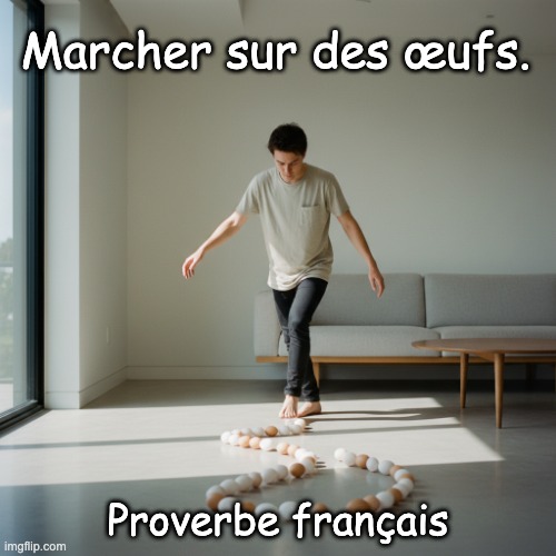 Image: Peter van Geest AI. Signification 📌:  Agir avec une extrême prudence, pour éviter d’envenimer une situation, de commettre une erreur, ou de froisser quelqu’un. Idée de délicatesse et de tension: on avance, mais avec la peur de “casser” quelque chose. Nuances: Registre: courant. Contexte typique: relations tendues, diplomatie, réunions sensibles, discussions avec une personne susceptible. Origine 🕰️:  L’expression s’appuie sur l’image concrète d’œufs très fragiles: « marcher dessus » impose une attention maximale. Elle est attestée en français depuis plusieurs siècles (au moins XVIIIe–XIXe s.) et s’inscrit dans une famille d’images proches en langues européennes. Pas de source unique ni d’événement fondateur: c’est une métaphore populaire devenue idiome. Auteur: Ce n’est pas une “citation” d’auteur, mais une expression idiomatique de la langue française. Donc: pas d’auteur identifié. Exemples d’usage ✍️: « Depuis la dispute, on marche tous sur des œufs au bureau. » « Avec ce client, il faut marcher sur des œufs pour ne pas le braquer. » « En période de négociations, le gouvernement marche sur des œufs. » Synonymes et proches 💬:  Faire très attention; avancer avec précaution; ménager quelqu’un; peser chaque mot. Plus imagé: « avancer sur la pointe des pieds », « manier avec des pincettes ». Antonymes: Foncer tête baissée; parler cash; y aller franco. Équivalents dans d’autres langues 🌍: Anglais: to walk on eggshells. Espagnol: andar con pies de plomo (être très prudent); aussi andar sobre cáscaras de huevo (calque, moins courant). Italien: camminare sulle uova (calque existant); agire con i piedi di piombo (prudence). Allemand: auf Eiern gehen (image proche); sich auf dünnem Eis bewegen (sur un terrain risqué). Variantes en français 🧩: « Avancer sur des œufs » « Être sur des œufs » (sentiment d’inconfort, tension continue).