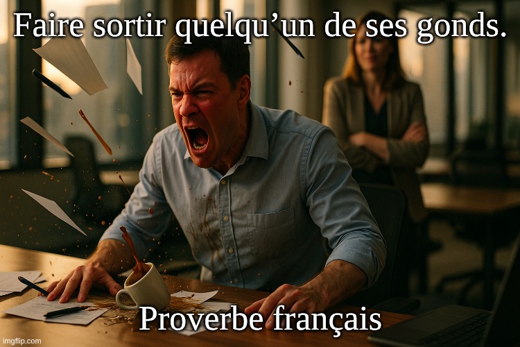 Image: Peter van Geest AI. 🧠 Signification: Expression idiomatique signifiant: Faire perdre son sang-froid à quelqu’un. Mettre quelqu’un en colère / l’exaspérer / le pousser à bout 😡. Nuance: “Faire sortir quelqu’un de ses gonds” = forme causative (vous provoquez la colère de l’autre); “Sortir de ses gonds” = la personne perd elle-même son calme. 🏛️ Origine: “Gonds” = les charnières/pivots d’une porte (pièces métalliques sur lesquelles elle tourne) 🚪🔩. Sens premier (ancien): une porte “sort de ses gonds” lorsqu’elle est arrachée de son pivot — image d’un mouvement brusque et incontrôlé. Sens figuré (par analogie): une personne “sort de ses gonds” quand elle perd ses repères et son sang-froid. Attestée dans la langue depuis l’époque classique (XVIIe siècle), prolongeant des emplois plus anciens de “hors de ses gonds” au sens propre. ✍️ Auteur: Pas d’auteur unique: c’est une locution idiomatique de la langue française, issue de l’usage populaire et reprise par de nombreux écrivains au fil des siècles. 🔁 Synonymes utiles: Mettre hors de soi • Faire péter un câble (fam.) • Rendre furieux/furieuse • Faire perdre son calme • Énerver à l’extrême. ✅ Exemples brefs: “Ses interruptions constantes m’ont fait sortir de mes gonds.” “Cette injustice la fait littéralement sortir de ses gonds.”