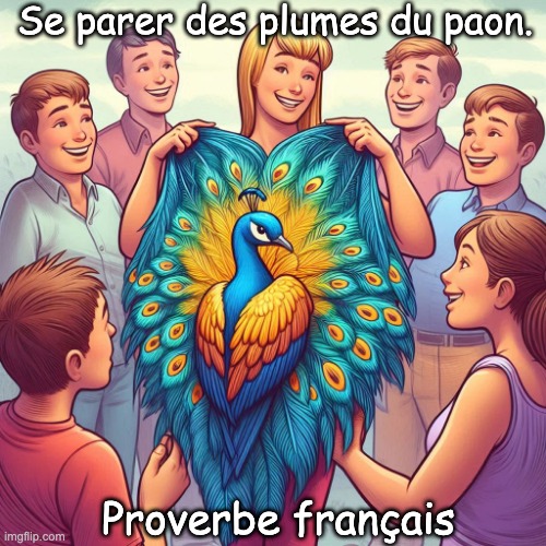 Image: Peter van Geest AI. Signification ✅ : Se vanter de quelque chose que l’on n’a pas fait ou mérité soi-même, ou s’attribuer le mérite du travail, des réussites ou des possessions d’autrui. Cette expression a souvent une connotation négative : elle suggère la malhonnêteté ou la prétention. 🧠 Origine : L’expression remonte à une fable classique, généralement attribuée à Ésope. Dans cette fable : un choucas (ou parfois un autre oiseau) se cache dans les plumes d’un paon (ou d’autres plumes remarquables). Il tente d’impressionner les autres et de se faire passer pour quelqu’un de « spécial ». Finalement, il est démasqué et perd son statut (et souvent, littéralement, ses plumes). 🔎 Pourquoi « plumes » ? : Les plumes (en particulier celles du paon) symbolisaient la splendeur, le statut et l’ostentation. La métaphore est donc la suivante : se parer de l’éclat d’autrui. ✍️ Auteur : Il ne s’agit pas d’une citation d’un auteur précis, mais d’une expression/d’un proverbe courant. L’origine de cette expression narrative se trouve chez Ésope (Esopus), source classique de la fable 📜. Dans la littérature européenne, le motif s’est ensuite répandu grâce à des adaptations, comme celle de Phèdre (adaptateur de fables latines). On le retrouve également dans divers recueils de fables européens (par exemple, dans la tradition de La Fontaine), mais son origine est plus ancienne. En bref : l’expression est d’origine populaire et linguistique, et son origine la plus connue est la fable d’Ésope. 🗣️ Exemples (courts et clairs) : « Il prétendait avoir dirigé le projet, mais il s’attribuait le mérite du travail d’autrui.» « Elle s’est attribué tout le mérite de la conception — exemple typique de s’attribuer le mérite du travail d’autrui.» 📚 Expressions apparentées : « S’attribuer le mérite de », « Voler le travail/les gains de quelqu’un », « Se vanter » (peut être neutre ou positif, mais similaire).