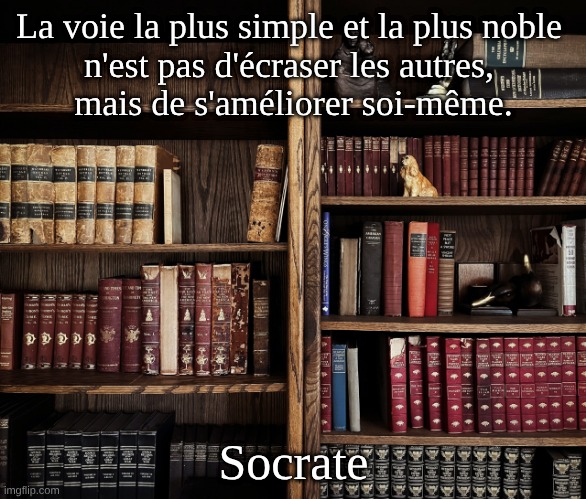 Inspiration : Elle encourage chacun à se concentrer sur son propre développement et sa propre croissance, plutôt que de se comparer aux autres ou de chercher à les surpasser. Origine : Contexte général : Cette citation est courante dans le domaine du développement personnel et de la motivation. Elle met l’accent sur la philosophie du développement personnel et l’éthique. La citation reflète les idées socratiques sur le perfectionnement de soi et le comportement éthique. Socrate prônait le perfectionnement de soi comme la véritable voie vers la sagesse et la supériorité morale. Philosophie : Socrate insistait sur l’importance de la connaissance de soi et d’une vie vertueuse. Sa méthode consistait notamment à poser des questions (la méthode socratique) pour approfondir sa compréhension. Auteur : Cependant, aucune publication ne permet d’affirmer avec certitude que Socrate soit l’auteur de cette citation.