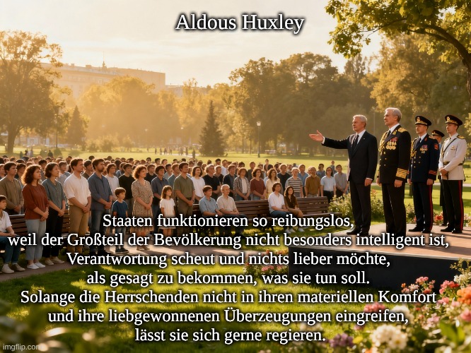 Staaten funktionieren so reibungslos, weil der Großteil der Bevölkerung nicht besonders intelligent ist, Verantwortung scheut und nichts lieber möchte, als gesagt zu bekommen, was sie tun soll. Solange die Herrschenden nicht in ihren materiellen Komfort und ihre liebgewonnenen Überzeugungen eingreifen, lässt sie sich gerne regieren.