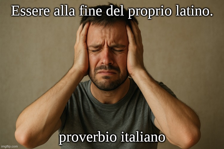 Immagine: Peter van Geest AI. Significato: Non sapere più cosa fare; non vedere più alcuna via d’uscita; essere esausti (fisicamente, mentalmente o in termini di idee). Origine: L’espressione deriva dall’insegnamento medievale latino. Nel periodo in cui il latino era la lingua della scienza e dell’istruzione (dal Medioevo fino al XVIII secolo), significava letteralmente: qualcuno è arrivato al punto di non sapere più cosa dire in latino, quindi non conosce più parole, la sua conoscenza è esaurita. Successivamente è stato usato in senso figurato: qualcuno non ha più mezzi o idee, è “alla fine del suo latino”.