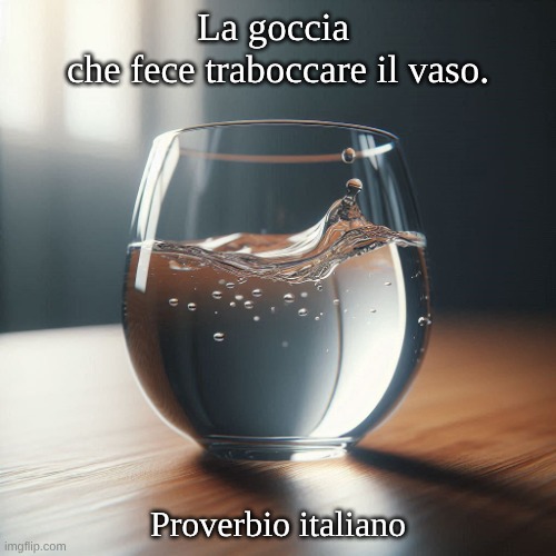 Immagine: Peter van Geest AI. Significato: l’ultimo di una serie di fastidi, problemi o eventi che porta una persona al limite della sopportazione o rende una situazione insostenibile. L’immagine è quella di un secchio che si riempie lentamente di gocce: ogni goccia è insignificante di per sé, ma alla fine l’ultima goccia fa traboccare il secchio. Così, un piccolo evento può sembrare innocuo di per sé, ma se segue una lunga serie di problemi, può rendere la situazione insostenibile. È usato per indicare che la pazienza, la tolleranza o la capacità di sopportare qualcosa di una persona sono completamente esaurite. Origine: un detto molto antico, la cui origine esatta e l’autore non possono essere determinati con certezza. L’espressione deriva probabilmente dal latino: “gutta cavat lapidem” (una goccia scava la pietra), ma la forma specifica con il secchio sembra essere di origine olandese o germanica.