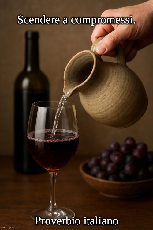 Immagine: Peter van Geest AI. Significato: scendere a compromessi, cedere o moderare le proprie richieste per raggiungere un accordo. Si “diluono” per così dire i propri desideri, in modo da rendere possibile la collaborazione o la pace. Origine: detto popolare tradizionale. L’espressione deriva dall’antica cultura europea del bere. Nell’antichità classica (in particolare dai Greci e più tardi anche dai Romani) il vino veniva quasi sempre diluito con acqua. Bere vino puro era considerato incivile o malsano. Chi era disposto ad aggiungere acqua al vino dimostrava di essere disposto a mantenere la calma, evitare conflitti o assumere un atteggiamento più moderato. Nel Medioevo e nella prima età moderna questa immagine è rimasta: aggiungere acqua al vino ne indebolisce il sapore → in senso figurato: indebolire la propria posizione per renderla accettabile agli altri.