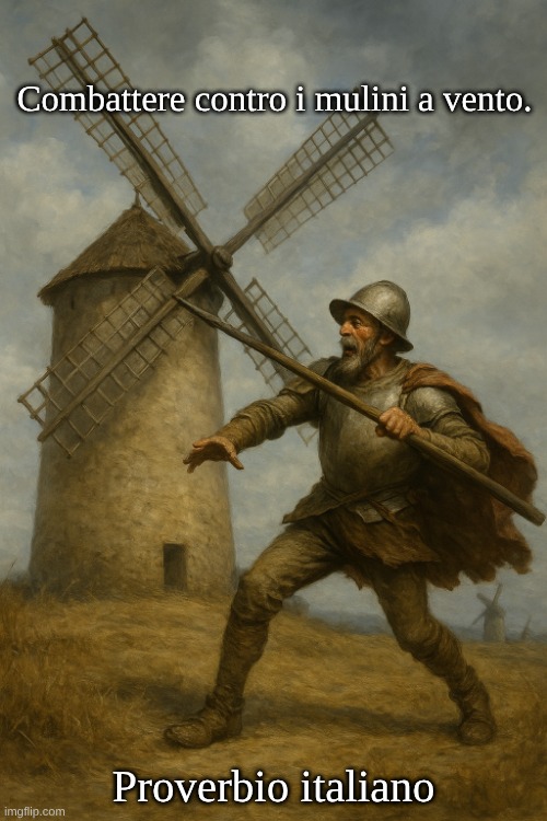 Immagine: Peter van Geest AI. Significato: Combattere contro nemici immaginari. Impegnarsi in una battaglia impossibile o inutile. Vedere un problema che in realtà non esiste. Idealismo che si scontra con la realtà. Spesso usato per descrivere qualcuno che lavora duramente contro qualcosa che non può essere cambiato o che valuta male il problema. Origine: Deriva direttamente dal famoso romanzo spagnolo Don Chisciotte (El ingenioso hidalgo Don Quijote de la Mancha) di Miguel de Cervantes, pubblicato nel 1605 (parte I) e nel 1615 (parte II). In una delle scene più famose, Don Chisciotte vede in lontananza dei mulini a vento e pensa che siano giganti. Li attacca, rimane impigliato nelle pale e viene scaraventato a terra.