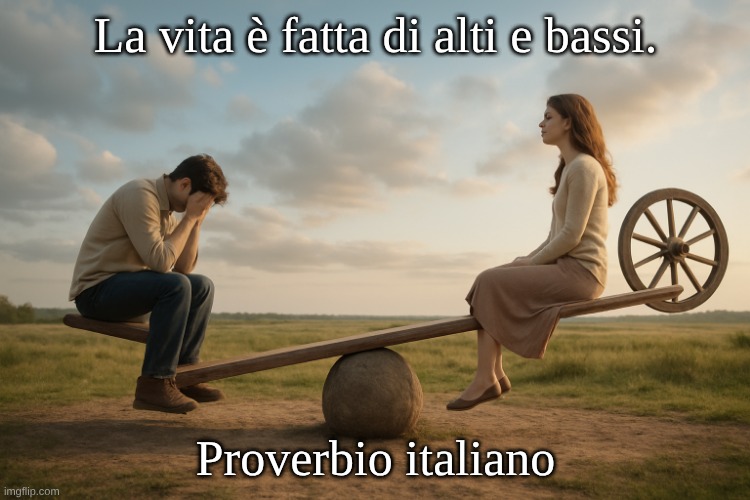 Immagine: Peter van Geest AI. Significato: La vita è fatta di alti e bassi; prosperità e avversità si alternano continuamente. Origine: Proverbio popolare, autore: anonimo.