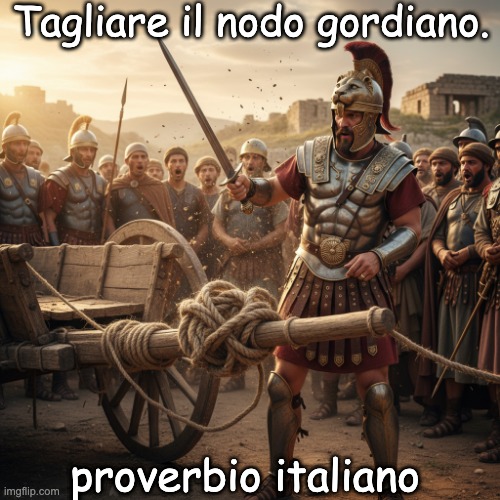 Immagine: Peter van Geest AI. Significato: Risolvere un problema complesso e in stallo prendendo una decisione forte e diretta, spesso senza esaminare tutti i dettagli passo dopo passo. Connotazione: risolutezza e risolutezza 💪, a volte anche: soluzione non convenzionale o indiretta. 🧠 Origine (mitologico-storica): L’espressione ha origine nell’antica Grecia ed è associata alla città di Gordio (nell’antica Frigia, oggi Turchia). Secondo la leggenda, lì c’era un carro con un nodo estremamente complicato (il nodo gordiano) attaccato al timone. C’era una profezia: chiunque fosse riuscito a sciogliere il nodo sarebbe diventato sovrano dell’Asia. ⚔️ Chi “tagliò” il nodo? Fu Alessandro Magno (356–323 a.C.) 👑. Invece di sciogliere il nodo con precisione, si dice che lo abbia tagliato con la sua spada. Così facendo, risolse il problema con un’unica potente azione: esattamente l’idea del detto. (Esistono varianti della tradizione: alcune fonti suggeriscono che Alessandro abbia sciolto il nodo “abilmente” rimuovendo uno spillo/cuneo. Ma la versione classica è: tagliato con la spada.) ✍️ Autore:Non esiste un “autore” nel senso di una singola persona che ha coniato il detto. È un’espressione idiomatica che si è sviluppata nelle lingue europee dalla tradizione classica. Gli scrittori antichi più famosi che hanno tramandato la storia (in varianti) sono tra gli altri: Arriano (Anabasis Alexandri) 📜, Plutarco (Vita Alexandri) 📜, Quinto Curzio Rufo (Historiae Alexandri Magni) 📜. ➡️ Quindi: Alessandro Magno è la figura storica a cui viene attribuito il “compimento” dell’azione (nella leggenda), ma l’espressione stessa si è affermata come detto in seguito. 🧩 Breve esempio di utilizzo: “Le trattative erano in stallo, quindi il direttore tagliò il nodo gordiano e optò immediatamente per il piano B.”