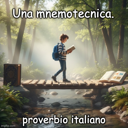 Imaggine: Peter van Geest AI. Significato: Uno strumento per ricordare o memorizzare facilmente qualcosa. Traduzione del latino pons asinorum.Origine: Gli asini hanno molta paura dell’acqua e si rifiutano ostinatamente di guadare anche i corsi d’acqua più piccoli, anche se potrebbero gestirli fisicamente facilmente (“asino testardo”), perché un asino non può vedere quanto è profondo il corso d’acqua a causa della superficie riflettente dell’acqua. Pertanto, piccoli ponti furono costruiti per loro in corrispondenza dei guadi, noti come “ponti mnemonici”. Analogamente, un mnemonico proverbiale è una deviazione o uno sforzo speciale che tuttavia porta più velocemente – o non porta affatto – alla destinazione. Inoltre, gli asini non attraversano tutti i ponti, perché calpestano solo terreni che sembrano loro completamente sicuri. Attraversano solo ponti che offrono loro sicurezza. Il “ponte mnemonico” quindi è anche sinonimo di sicurezza.