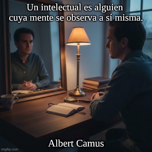 La mente puede observarse a sí misma (metacognición); puedes examinar críticamente tus propios pensamientos, suposiciones y motivos. Implícitamente, también puede haber un ligero matiz irónico: un intelectual puede estar tan absorto en la autoobservación que la acción/vida se desvincula. 📚 Origen: Contexto original: Cuadernos de Camus (observaciones breves y aforísticas). Cita como en las obras de referencia de Oxford: Cuadernos, 1935-1942 — a menudo se menciona como escrito entre 1935 y 1942, publicado póstumamente (1962). ✍️ Autor: Albert Camus (1913-1960) ✅. Fuentes de Oxford como Oxford Dictionary of Quotations y Oxford Essential Quotations lo enumeran bajo Camus con referencia a Carnets/Notebooks (1935-1942), lo que apoya firmemente la atribución.